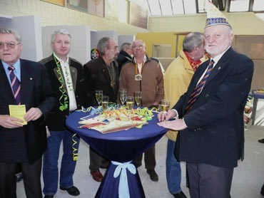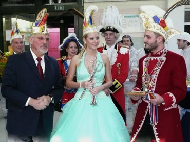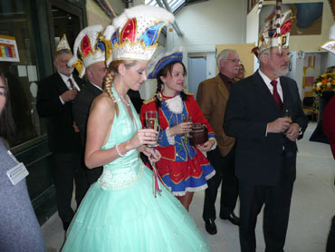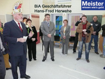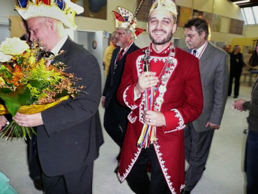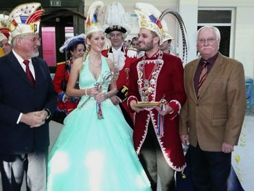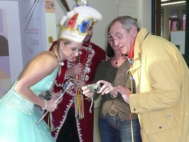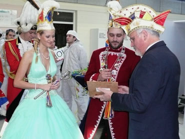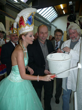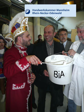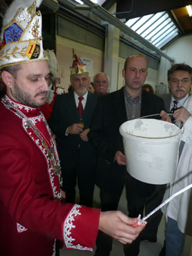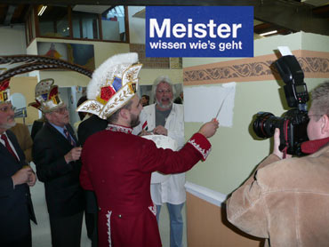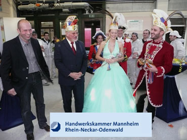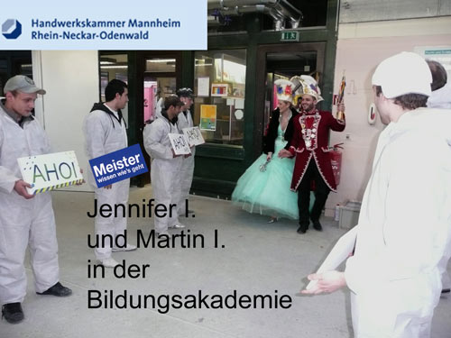 Der Präsident der Handwerkskammer Mannheim Rhein-Neckar-Odenwald Herr Tschischka und der Obermeister der Maler- und Lackierer-Innung Mannheim Herr Maier begrüßten das Mannheimer Prinzenpaar Jennifer I. und Martin I.! Der kleine Empfang fand in den Ausbildungsräumen der Maler- und Lackierwerkstatt in der Bildungsakademie der Handwerkskammer Rhein-Neckar-Odenwald statt. Das war praktisch ein Heimspiel für unseren Stadtprinzen Martin I. da es auch sein Berufsstand ist! Martin I. musste auch sein Talent mit dem Farbroller unter Beweis stellen. Gekonnt stellte er sich der Probe! Auch Jennifer I. ließ es sich nicht nehmen, das Gleiche zu tun. Ohne sich verkleckert zu haben stärkte man sich dann mit Sekt und Kaltgetränken sowie leckere süsse Teile von der BiA. Auch wurden nach viele Gruppenfotos Orden an die kleine Narrengemeinde verteilt! Schnell verging die Zeit mit interessanten Gesprächen und das Prinzenpaar verabschiedete sich von den Handwerksnarren.