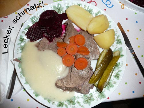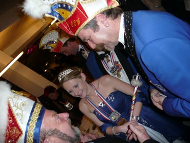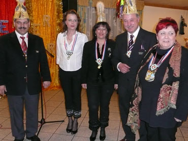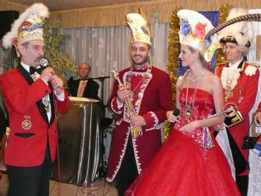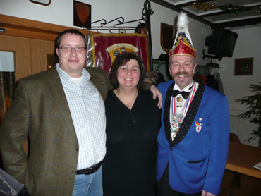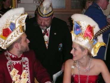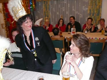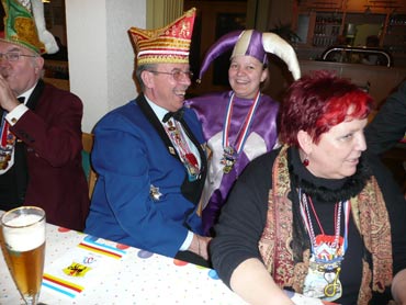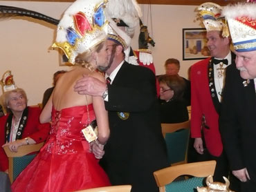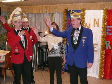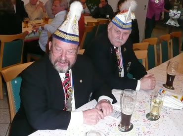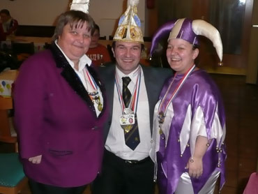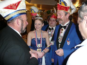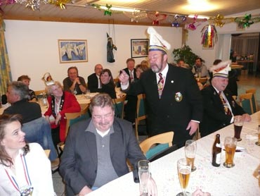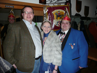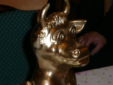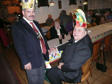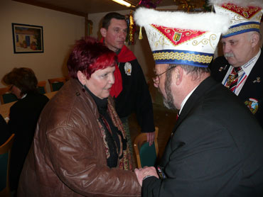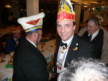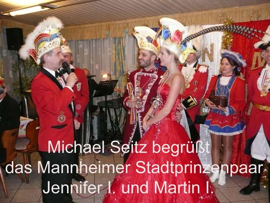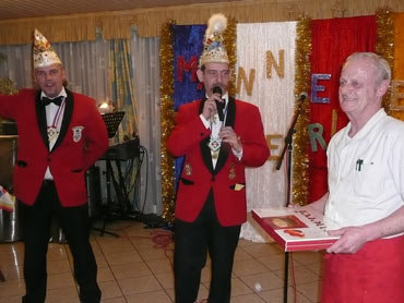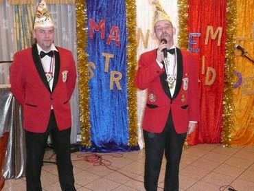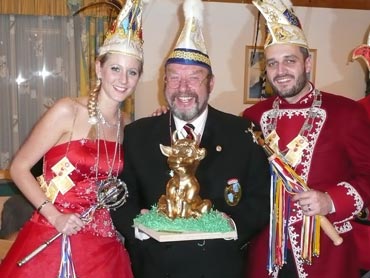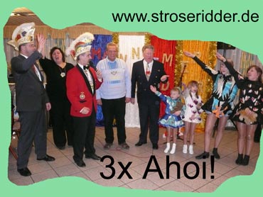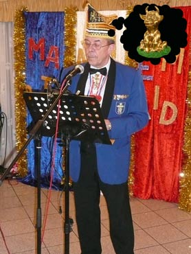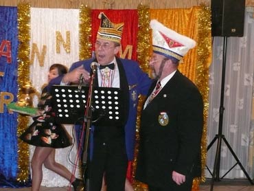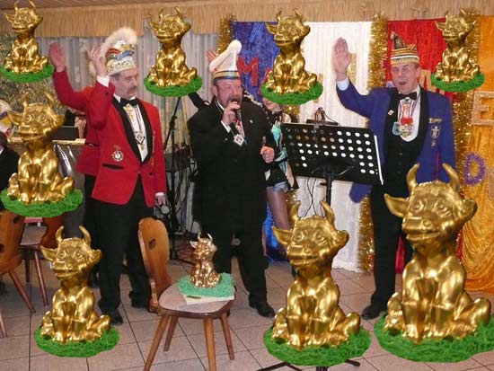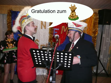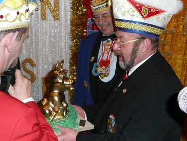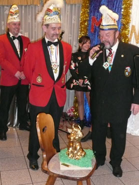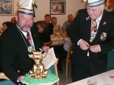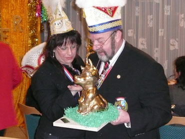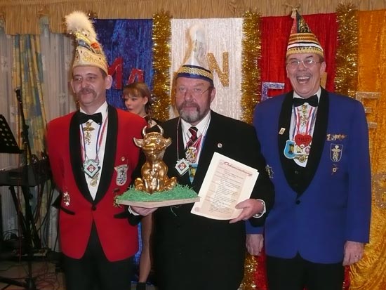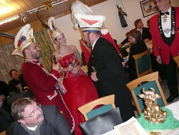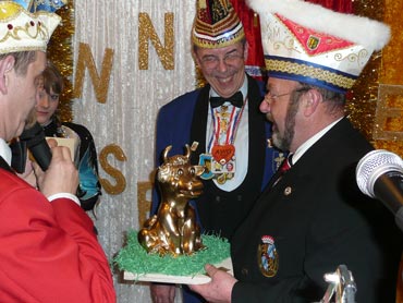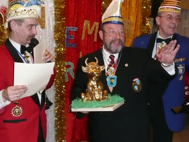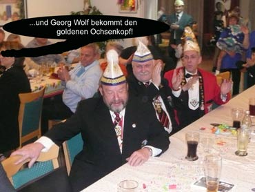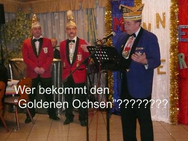 Ein närrische Jubiläum stand in der Kampagne 2007/2008 bei den Stroserdder an! Der 11te "Goldene Ochsen! sollte vergeben werden. Zuvor begrüßte Präsident Michael Seitz die närrische Gäste und verteilte den Stroseridder-Jahresorden an aktive vom Verein und an Narrenpersönlichkeiten. Dann kam das Mannheimer Prinzenpaar Jennifer I. von der NNG und Martin I. vom Feruerio und der Michael begrüßte sie sehr herzlich. Nach deren Motto gabe es leckeres Ochsenfleisch mit Meerrettigsauce und Beilagen. Das hat lecker geschmeckt! Gratulation an die Küche! Nach Ballett und Peter Schick ging Rainer Holzhauser ans Mikro und sprach in Reimen und im Rätsel. Hervorragend vormuliert und sinnig bis ins Detail ausgefeilt gab er immer mehr Hinweise, wer der neue "Goldene Ochsenkopf" bekommen sollte. Dann war es klar - der Präsident der Karneval-Kommission Mannheim Georg Wolf sollte den "Goldenen Ochsen" bekommen! Sichtlich gerührt nahm er diese Auszeichnung für seinen Einsatz für die Kurpfälzer Fasnacht von Michael Seitz entgegen.