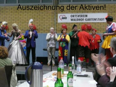 Der erste Vorsitzende der AWO Waldhof/Gartenstadt/Lutzenberg Stefan Höß (alias Schneewittchen) begrüßte die Narren im vollbesetzten großen Saal vom Kulturhaus Waldhof. Seine fleißigen Helfer von dem 10. Fasnachtskaffeenachmittag waren als lustige Zwerge verkleidet. Er führte durch die kurzweilige Veranstaltung mit viel Humor und Finesse. Auch der CCW-Präsident Rolf Remmele war guter Laune und brachte die Narren zum Lachen. Auch im Kulturhaus dabei war die Prinzessin Miranda die I. von Dienstleisttanien Prinzessin des CCW 2011/2012. Es war wieder eine super Veranstaltung mit Urgestein Hans Schmidt und Manfred Baumann. Ebenso Karin Hinz und der überragende Musikprofessor Werner Beidinger gaben ihr Bestes für die Narrenschar. Das AWO-Ballett und die Tanzmariechen Selina Trnka, Alina Gräff und Samatha Höß der Garden des CCW waren absolute Glanzpunkte im kurzweiligen Programm. Die Zeit verging von 14.11 Uhr bis 18.30 Uhr wie im Fluge und nach den Ehrungen der Aktiven auf der Bühne sagte Schneewittchen auf Wiedersehen bis zum 11ten Fasnachts-Kaffeenachmittag 2013!