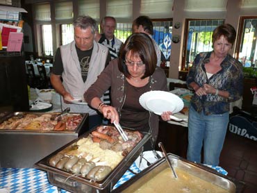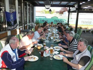 Bei herrlichem Sonnenschein kamen wir gegen 13.30 Uhr zum SVW-Tennisplatz angereist. Unsere Tennisfreunde von der Blumenau kamen mit sechs starken Tennisspielern angeführt von dem 2. Vorsitzenden des Vereines und MF Günter Vogt! Wir konnten gleichzeitig auf sechs gut vorbereiteten Plätzen spielen und nach der ersten Runde stand es schon 4:2 für den SVW! Nach der Kaffee- und Kuchenpause ging es mit der Unterstützung der Heimspielerfrauen in die Doppelrunde. Das dritte Doppel spielte schnelle Bälle und konnte mit dem Sieg unaufholbar den Erfolg der SVW-Mannschaft sichern. Am Ende stand es 6:3 für den Traditionsverein auf dem Waldhof. An diesem schönen Tag gab es keine Verlierer, sondern nur Gewinner. Unser Clubwirtin Frau Heise zauberte ein leckeres Schlachtbuffet auf den Tisch und machte obendrein noch eine Himbeergeistrunde. Was will das Herz mehr? Die Mannschaftsführer sprachen Grußworte und interessante Gespräche wurden geführt.