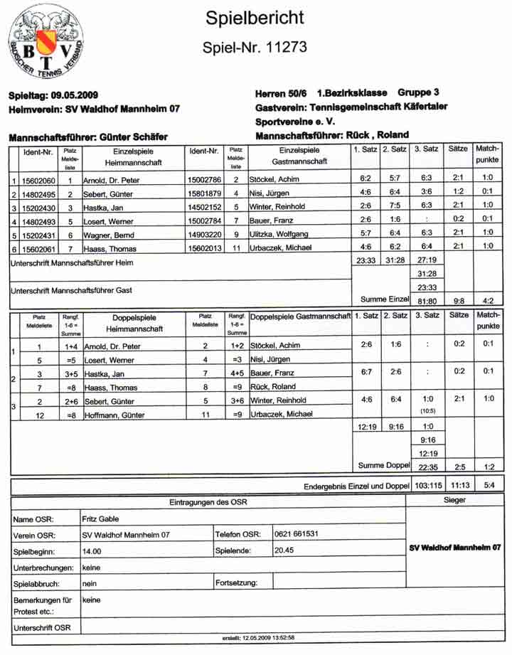 Käfertal kam zu uns, und wollte unbedingt einen Sieg heimfahren. Die Mannschaft vom SV-Waldhof war bei ihrem ersten Medenspiel gut vorbereitet. Wenn man gut vorbereitet ist, dann kann man auch etwas bewegen. Das zeigte sich nach der Einzelrunde deutlich! 4:2 setzten sich die Waldhöfer ab und die Kuchenpause wurde genutz, um die Doppel richtig zu platzieren. Ein Doppelsieg mußte her und das gelang mit Sam und G. Hoffmann. Eine geschlossene Mannschaftsleistung und der Sieg mit 5:4 war unser! Gratulation an den fairen Gegener aus Käfertal und an die siegreiche Mannschaft vom SVW Herren 50!