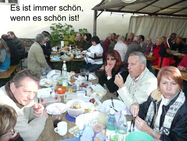 Wir trafen uns pünklich um 13.30 Uhr am SVW-Tennisplatz und fuhren mit vollgepackten Speisekörben im Kofferraum nach Mussbach. Das Wetter war super und deshalb waren die Sitzbänke in der Winzergenossenschaft auch alle besetzt! Gut, dass Reinhard und die Hanny für die Mannschaft Bänke und Tische reserviert hatten. Sodann belegten wir die Tische und diese bogen sich vor mitgebrachten Leckereien aus dem In- und Ausland. Lustig waren wir, wie man an den Bildern sehen kann. Dann ging die Sonne unter und die Kälte kam herauf für diejenigen, welche zu leicht angezogen waren. Dann kurz vor 19.30 Uhr brachen wir gemeinsam auf und fuhren nach Hause.