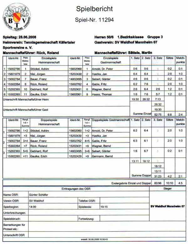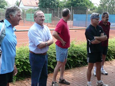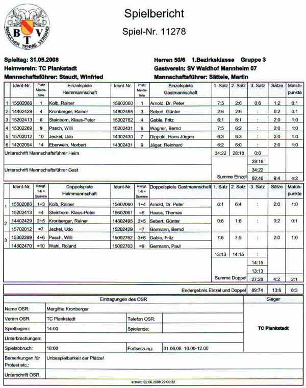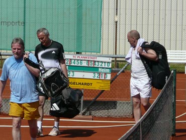 Gute vorbereitet für die neue Tennissaison sind wir zum Tennisverein TC Plankstadt gefahren. Wir haben gewusst, dass es starke Gegner sein werden. Leider sind wir nicht in bester Spielstärke angetreten. Wir sind von dem Mannschaftsführer Winfried und seine Spieler freundlich empfangen worden und nach der Einweisung ging es schon in die erste Runde. 1:2 und in der zweiten Runde stand es schon 2:4 gegen SV Waldhof Mannheim 07! Sam und Peter erkämpften die Punkte, doch mehr war leider nicht zu holen. Wir hatten zwar heimische Unterstützung durch unseren 1. Vorsitzenden Günter Hoffmann und Gattin sowie eigene Spielerfrauen als moralische und fachkundige Hilfe. Aber, der Erfolg für die Mannschaft blieb aus. Dann kam die Regen- und Gewitterpause die dazu führte, dass die Doppel erst am Sonntag gespielt wurden. Es gab noch am Samstag ein leckeres Mannschaftsessen und man grübelte über die Doppelpaarungen.