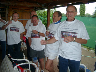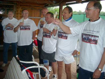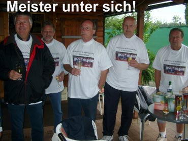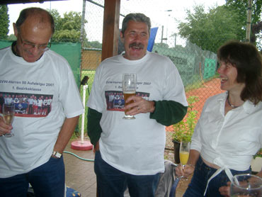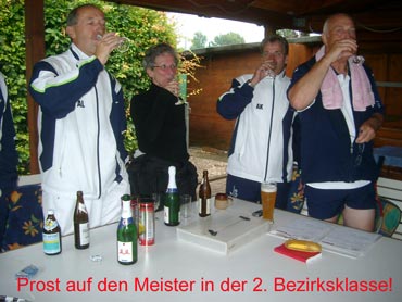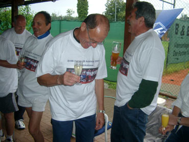 Nach dem 6:3 Sieg gegen die Straßenbahner gab es Sekt zu trinken und die Aufsteigerhemden wurden an die Meisterspieler verteilt. Große Momente an einem regnerischem Tag! Anschließen sind wir von den Straßenbahnern im Reiterstübel zum Mannschaftsessen eingeladen worden. Dankes- und Grußworte sprachen die beiden Mannschaftsführer aus. Lecker waren die Speisen und die Gläser waren nicht lange voll! Viel Freude beim Betrachten der Tennisbilder!