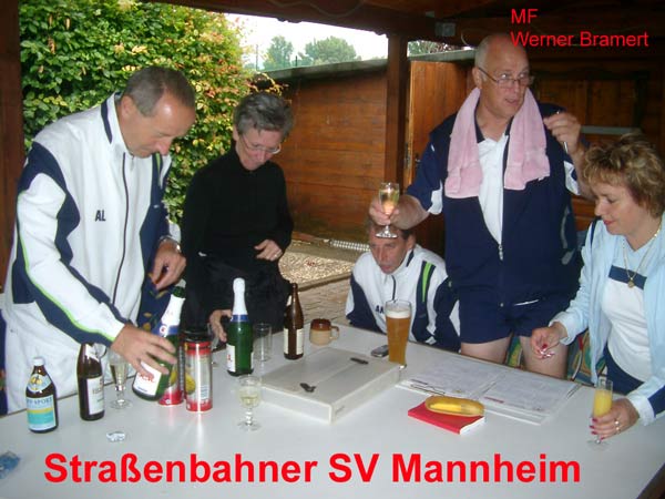 Bei regnerischem Wetter sind wir nach Neckarau und mit dem Meistertitel später nach Hause gefahren! So kann man eigentlich den letzten Spieltag beschreiben. Die Mannschaft der Straßenbahner begrüßten uns herzlich. Der Mannschaftsführer der Gastgeber Werner Bramert und sein Team hatten alles gut vorbereitet. Von den schönen Tennisplätzen angefangen bis zum reichhaltigen Kuchenbuffet. So waren dann auch die Spiele. Schnell flitzten die Bälle knapp über das Netz und die Punkte wurden nicht hergeschenkt. Nach einer kurzen Regenpause ging es fair weiter und am Ende wurde aus Sicht vom SVW, Geschichte geschrieben! Die Herren 50 vom SV-Waldhof Mannheim sind erster in der 2.Bezirklasse Gruppe 5 geworden! Wir spielen im nächsten Jahr in der 1. Bezirksklasse! Super Leistung von jedem Spieler! Danke auch an unsere treuen Fans und besonders an die Spielerdamen. Sie drückten an den Tennisplätzen die Daumen und spornten ihre Männer mit motivierenden zurufen an!!! Danke an dieser Stelle für die Unterstützung!